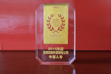 中意人壽榮獲 “2013年21世紀(jì)亞洲金融年會-21世紀(jì)保險年會”頒發(fā)的“2013年度穩(wěn)健經(jīng)營獎”,這是第四次獲獎,也是本屆唯一獲獎的合資保險公司。